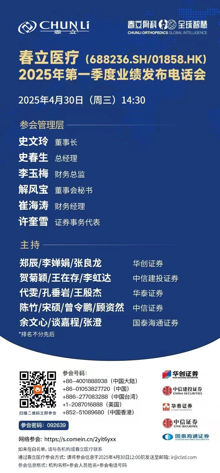 Founded in 1998, Chunli Medical (688236.SH + 01858.HK) has been committed to advancing the continuous development and research of high-end medical devices since its establishment. Currently, the company holds a total of 188 medical device registration certificates and filing documents in China, with products covering a full range of orthopedic devices including joint, spinal, sports medicine, and trauma-related categories. Meanwhile, it is actively expanding into fields such as dentistry, PRP (Platelet-Rich Plasma) preparation systems, orthopedic power systems, and surgical robots. The acquisition of multi-category registration certificates has further enriched the company's product portfolio, expanded its layout in the medical field, continuously met the diversified market and clinical needs, and enhanced its comprehensive competitiveness.While maintaining its leading position in the domestic market, Chunli Medical has actively expanded into the international market and successfully obtained product registration certifications in multiple overseas countries. Its hip, knee, and spinal product lines have all passed the annual CE system audit and surveillance audit smoothly. Meanwhile, the "Knee Joint Prosthesis System" has received 510(K) clearance from the U.S. FDA. These registration certifications are not only authoritative proof of the products' performance and safety but also signify that Chunli Medical's technological advantages have reached an internationally advanced level. The acquisition of these certifications not only strongly guarantees the continuous growth of the company's international sales revenue but also directly reflects its strong competitiveness in the global market. Currently, our products have been successfully exported to more than 50 countries and regions worldwide.Over the past more than 20 years since its establishment, Chunli Medical has assembled a multi-tiered team of professional and technical talents, including experts with over 20 years of industry experience, postdoctoral researchers, doctors, MBAs, masters, and bachelors. These talents cover multiple disciplinary fields such as mechanical design, materials science, biomechanics, clinical medicine, and computer science, jointly forming an interdisciplinary and compound professional team. This team provides strong intellectual support and talent guarantee for the company's technological innovation and business development.In April 2024, Chunli Medical was awarded the national - level title of "National Manufacturing Single - Item Champion Enterprise" by the Ministry of Industry and Information Technology of the People's Republic of China. It is the first and so far the only enterprise with artificial joint prostheses as its core business to hold this title. As one of the G20 Innovation - Leading Enterprises during the 13th Five - Year Plan period, Chunli Medical is also a National High - tech Enterprise, a National Specialized, Sophisticated, Unique and New "Little Giant" Enterprise, and a National Intellectual Property Advantage Enterprise. It holds multiple qualifications including a National Enterprise Technology Center, a National Postdoctoral Research Station, and the Beijing Artificial Joint Engineering Laboratory.The company actively participates in national and local scientific research projects, such as talent program projects of the Ministry of Science and Technology, the National Natural Science Foundation of China, and the China Postdoctoral Science Foundation. It has undertaken numerous scientific research tasks commissioned by government departments including the Ministry of Science and Technology, the Ministry of Industry and Information Technology, the Beijing Municipal Science and Technology Commission, the National Development and Reform Commission, and the Municipal Bureau of Economic and Information Technology. Meanwhile, as a leading enterprise, three of its key research materials have been successfully selected into the first batch of the national - level "Open Bidding for Biomaterials Innovation Tasks (Champion - Bid Program)"As a leading enterprise in China’s orthopedic industry, Chunli Medical has launched a number of innovative products that have filled gaps in the domestic market, enhancing the company’s core competitiveness and industry recognition. The company focuses on tackling key technological challenges in the industry and continuously elevates the level of independent innovation in China’s orthopedic field. Moving forward, Chunli Medical will continue to uphold the philosophy of "inheriting the essence of predecessors and developing high-quality products for the world," and adhere to the product R&D and production principle of "Treat products as if for our own use, and pursue continuous innovation." It is committed to providing high-quality products to global customers and becoming a world-renowned enterprise.