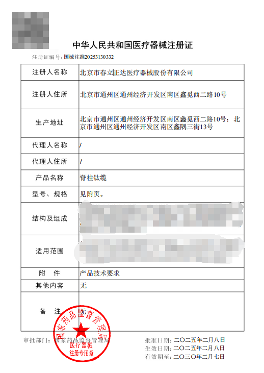 Beijing Chunlizhengda Medical Devices Co., Ltd.'s Spinal Titanium Cable has obtained registration approval from the National Medical Products Administration (NMPA) of the People's Republic of China