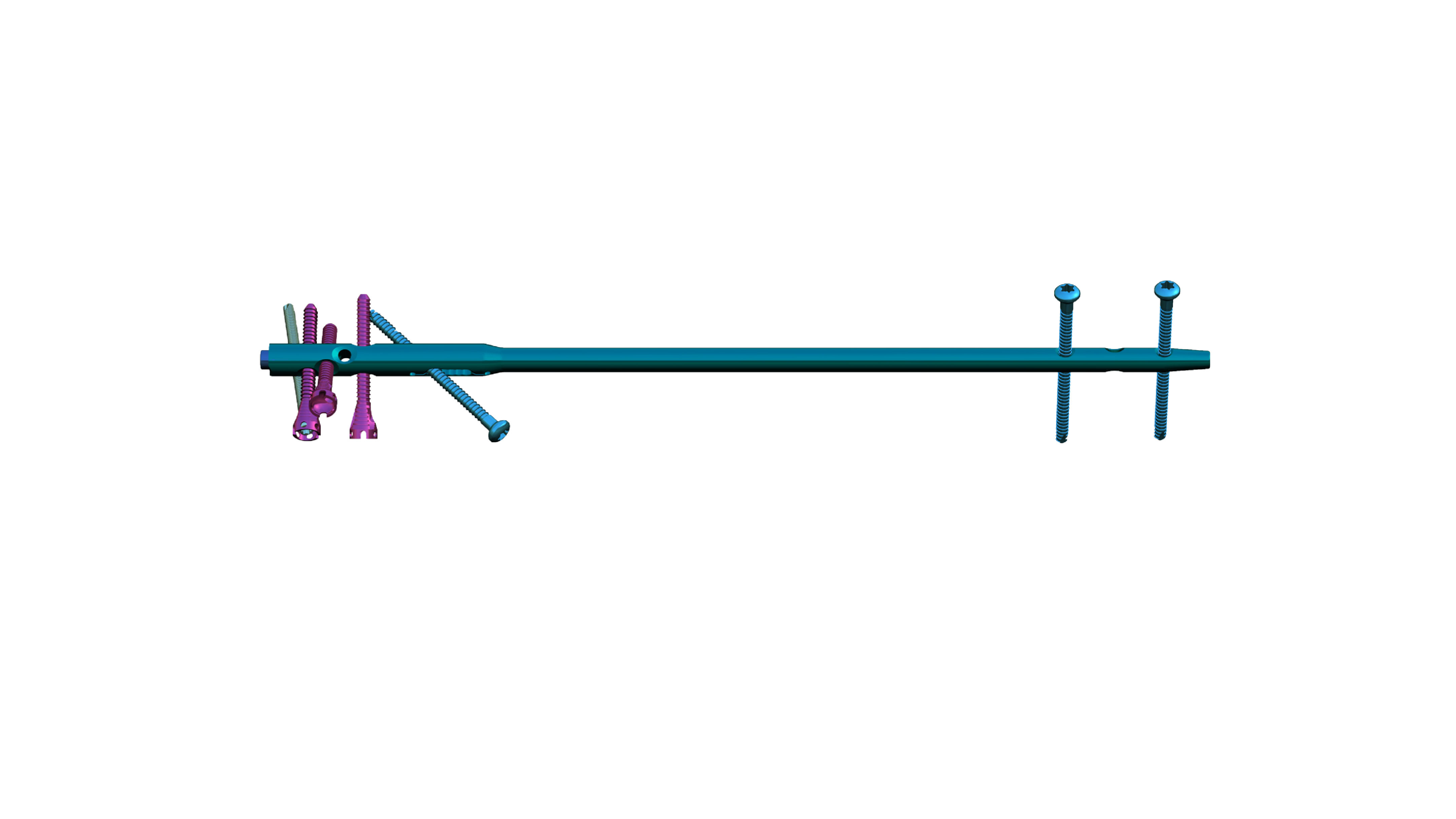 The metal locking intramedullary nail system consists of a main nail, a locking component, and a cap. The locking component includes a locking screw, a lag screw, and a spiral blade. Made of TC4 titanium alloy material that meets the requirements of GB/T 13810 standard.
