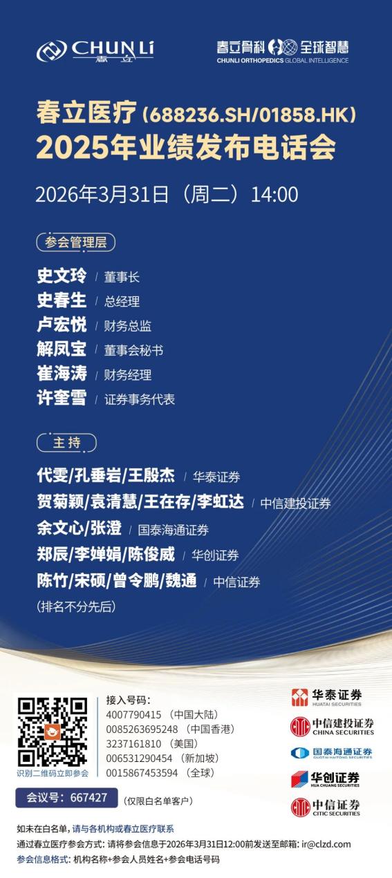 【邀请函】春立医疗2025年业绩发布电话会
