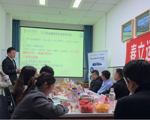 岳阳市中心医院张伟主任围绕《肩袖撕裂诊治经验体会》展开讲解,聚焦肩袖损伤的分型诊断、镜下操作技巧及术后康复策略,突出个体化治疗理念。紧接着,会议进入首轮讨论环节,参会代表就肩袖修补术中锚钉选择、缝合方式等实际问题展开交流,现场学术氛围浓厚。